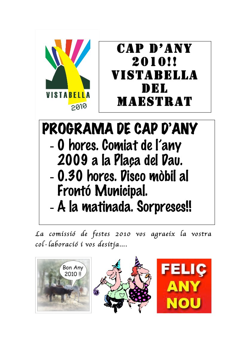 Hola, des de la comissió de festes 2010 us volem anunciar que la nit de cap d’any, després de les 12 campanades, hi haurà disco mòbil al frontó. Els ingressos es destinaran per a les festes i la responsabilitat de l’entrada i la barra serà de la comissió de festes 2010.