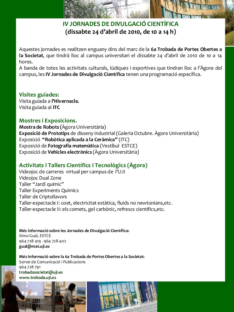 El pròxim dissabte 24 d’Abril hi haurà un autobús gratuït a càrrec de la UJI per a baixar des de Vistabella a la UJI i gaudir de les Jornades de divulgació científica 2010. Adjunt teniu el cartell amb els horaris de les activitats. I també en PDF.